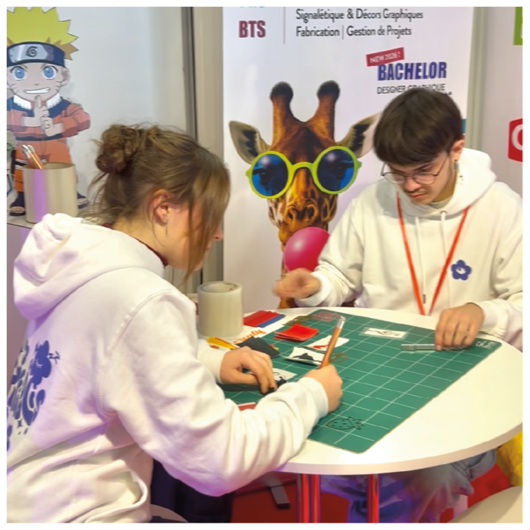 Deux de nos apprentis en BMA ont réalisé des démonstrations en direct de la technique de l’échenillage de stickers. Ce qui a permis aux jeunes lycéens et étudiants de découvrir concrètement les pratiques professionnelles d’un signaléticien et de mieux comprendre le métier.